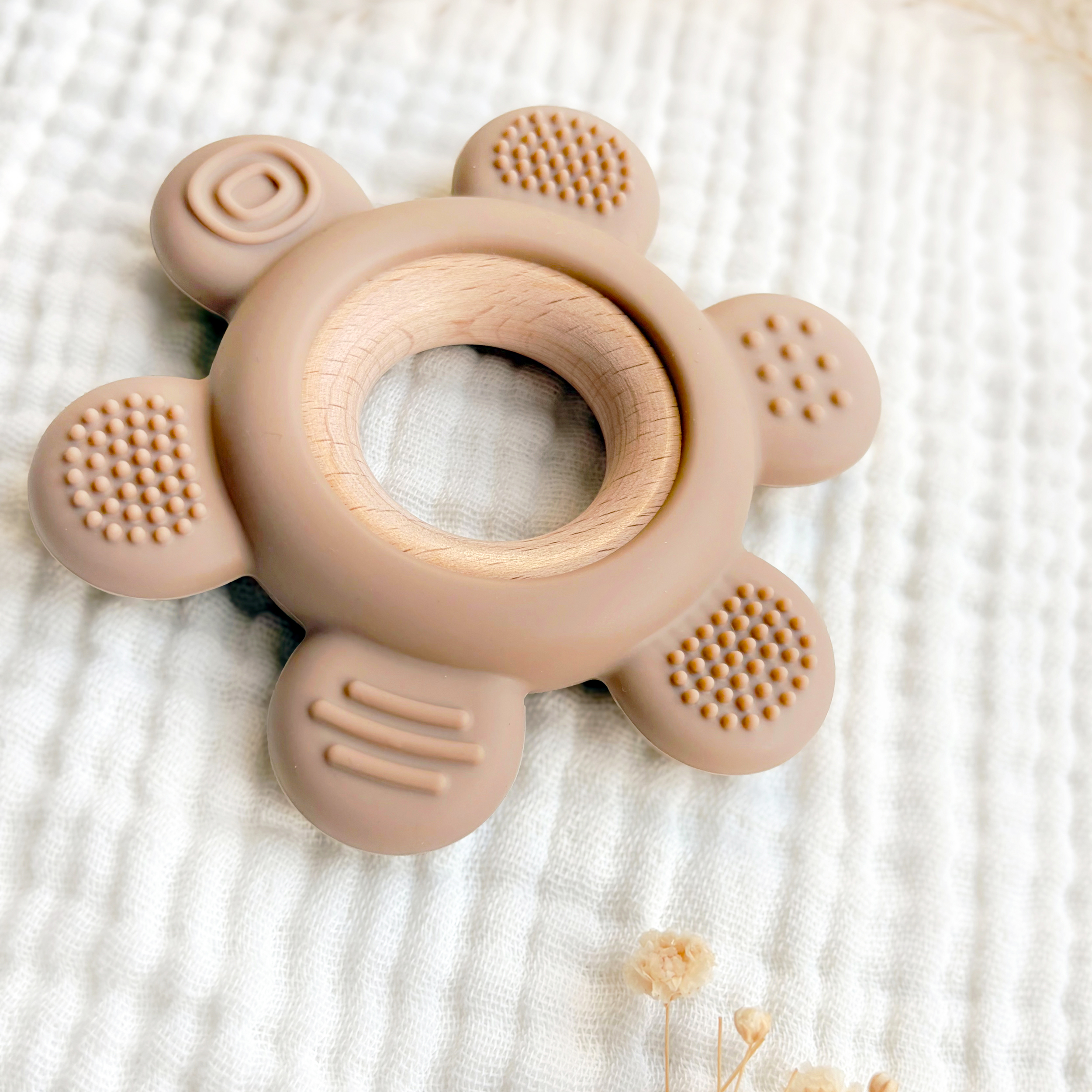 Voor kleine handjes en gevoelige tandjes. Deze bijtring is een fijne combinatie van natuurlijk hout en zachte siliconen kralen in een rustige taupe tint. Licht, veilig en prettig om vast te houden tijdens het doorkomen van de eerste tandjes. Diameter: 9,5 centimeter.